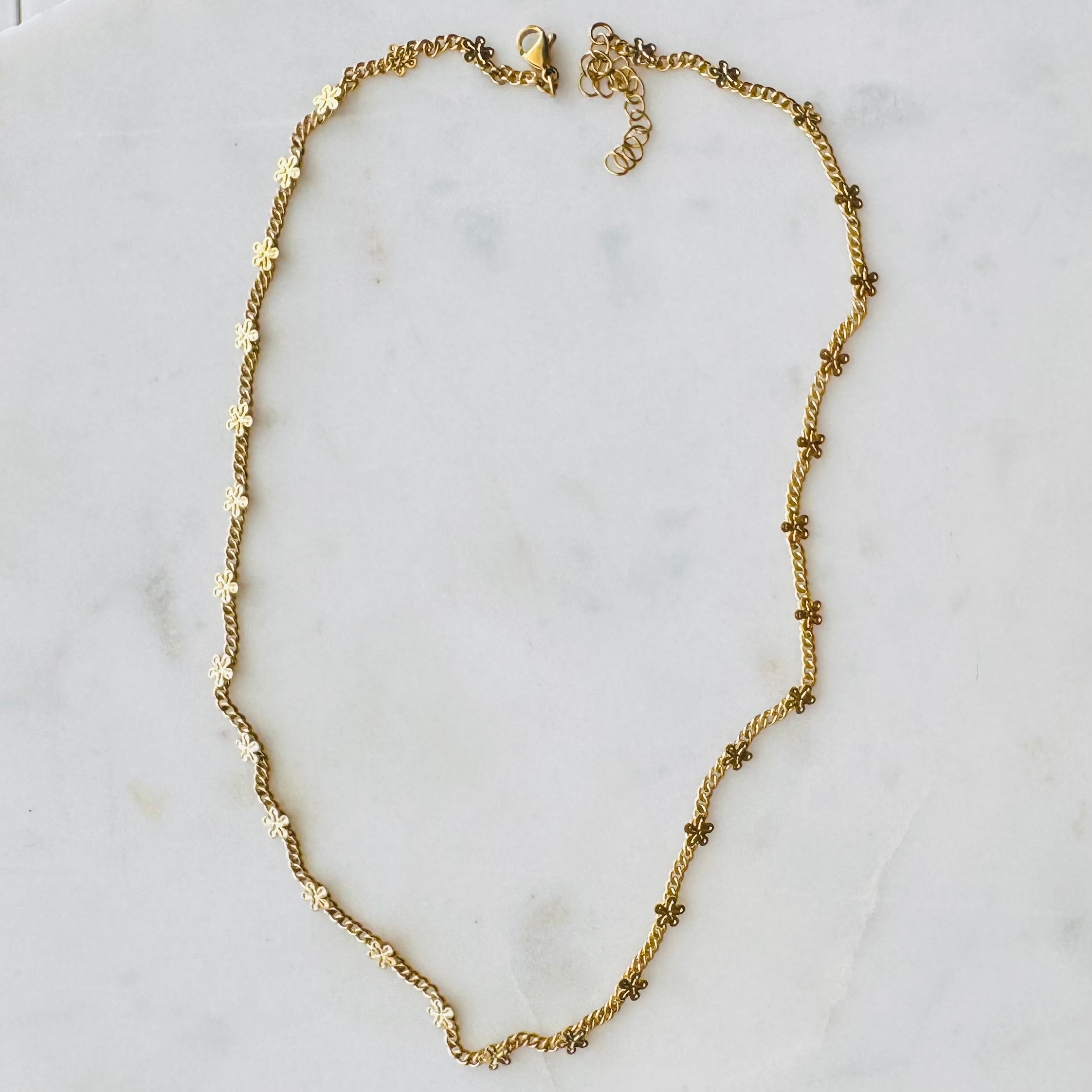Your new favourite layering essential. This delicate gold chain features tiny floral details throughout, giving it just enough texture to stand out while staying minimal and versatile.